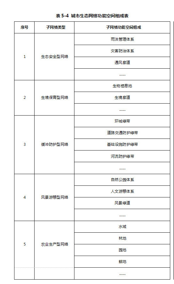 按照生態(tài)網(wǎng)絡(luò)功能用途,分別建構(gòu)生態(tài)安全型網(wǎng)絡(luò)、生境保育型網(wǎng)絡(luò)、緩沖防護型網(wǎng)絡(luò)、風(fēng)景游憩型網(wǎng)絡(luò)以及農(nóng)業(yè)生產(chǎn)型網(wǎng)絡(luò)五種類型的功能性子網(wǎng)絡(luò)。(詳見表5-4)